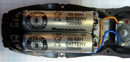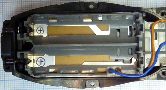 Вертикальные контакты V-образной формы не закрыты перегородками, как это было в первой бритве. Тщательное изучение геометрии посадочного места выявило очередной, 12-й сюрприз от конструктора изделия: — теперь дорабатывать ничего не надо! Всё спроектировано так, что ничего не мешает использовать стандартные аккумуляторы. Вся доработка сводится только к маркировке контактов «+», чтобы потом не перепутать. Да приданию лепесткам прогиба для пруженения с контактами стандартных аккумуляторов.